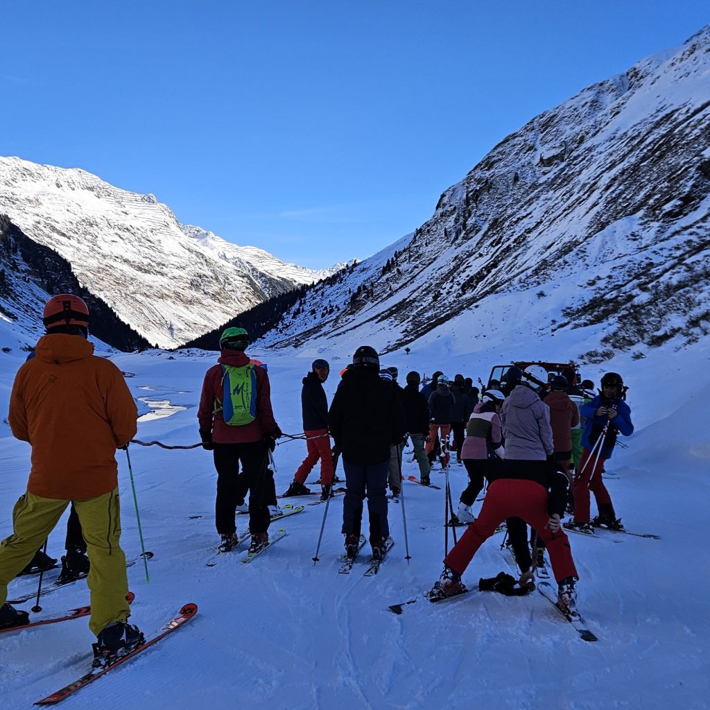 Nach einigen Abfahrten am Skilift der Bielerhöhe war der nächste Halt beim Sammelplatz der Safari. Von dort aus wurden wir von einem Pistenbully weiter nach Galtür gezogen. Im Skigebiet Galtür hatten wir genügen Zeit, um die Pisten unsicher zu machen. Natürlich kam der Einkehrschwung auch nicht zu kurz. Zum Abschluss beförderte uns der Pistenbully wieder hinauf auf Zeinisjoch. Vor dort gings über pulvrige Wege durchs Ganifertal zurück nach Partenen.